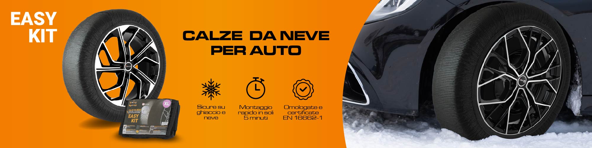 Avere a bordo della propria auto delle calze da neve antislittamento EASY KIT, rappresenta senza dubbio una soluzione rapida ed efficace per affrontare le situazioni più critiche in caso di nevicate improvvise. Le calze da neve EASY KIT sono realizzate con uno speciale tessuto tridimensionale che offre un’ottima trazione e rappresentano una soluzione semplice, economica ed estremamente efficace per affrontare la guida su neve e ghiaccio. Si installano in pochi minuti, molto più facilmente rispetto alle catene tradizionali, sono auto-centranti e si montano esclusivamente sulle ruote motrici. Riutilizzabili e lavabili, le calze da neve EASY KIT si possono lavare a mano (max 30°) e riporre facilmente nella loro custodia. Non producono vibrazioni, sono silenziose e non danneggiano cerchi, pneumatici o sospensioni. Compatibili con qualsiasi tipo di pneumatico, sono particolarmente indicate per i veicoli non catenabili.