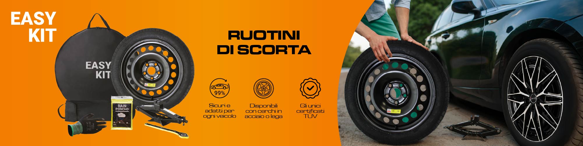 Il ruotino di scorta spesso non è incluso nella dotazione di un'autovettura e questo può causare seri problemi in caso di foratura o di gravi danni al pneumatico, rendendo talvolta indispensabile il ricorso al soccorso stradale. Per offrire la massima versatilità, EASY KIT è stato progettato per adattarsi alla maggior parte dei veicoli in circolazione — dalle city car ai SUV, dai furgoni ai camper. È disponibile con cerchio in acciaio oppure in lega, a seconda delle esigenze e delle dimensioni del veicolo.